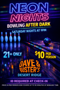 Turn down the lights and turn up the fun! Join Dave & Buster’s for Neon Nights at Dave & Buster’s Desert Ridge and experience a night out on the lanes — glowing lights, vibrant vibes, and late-night energy.